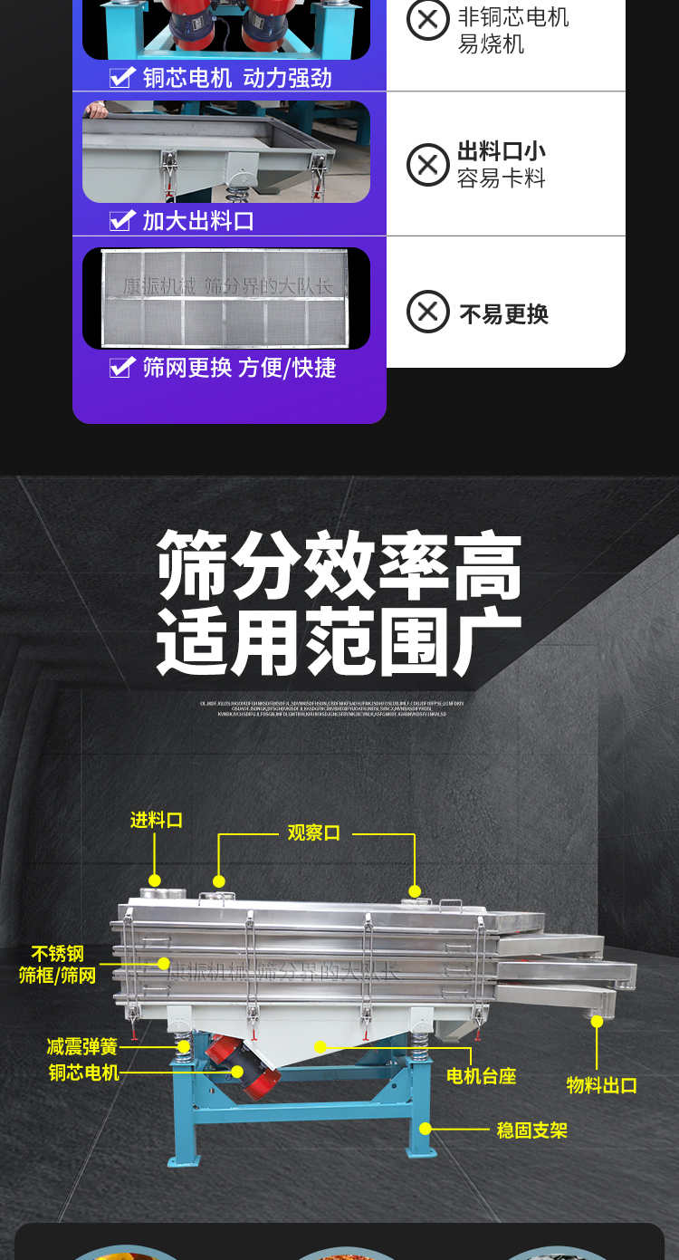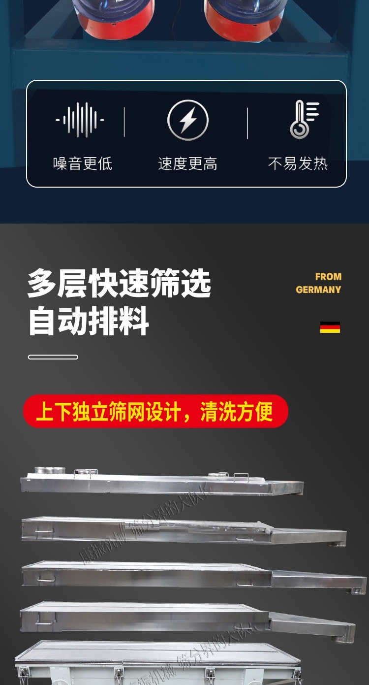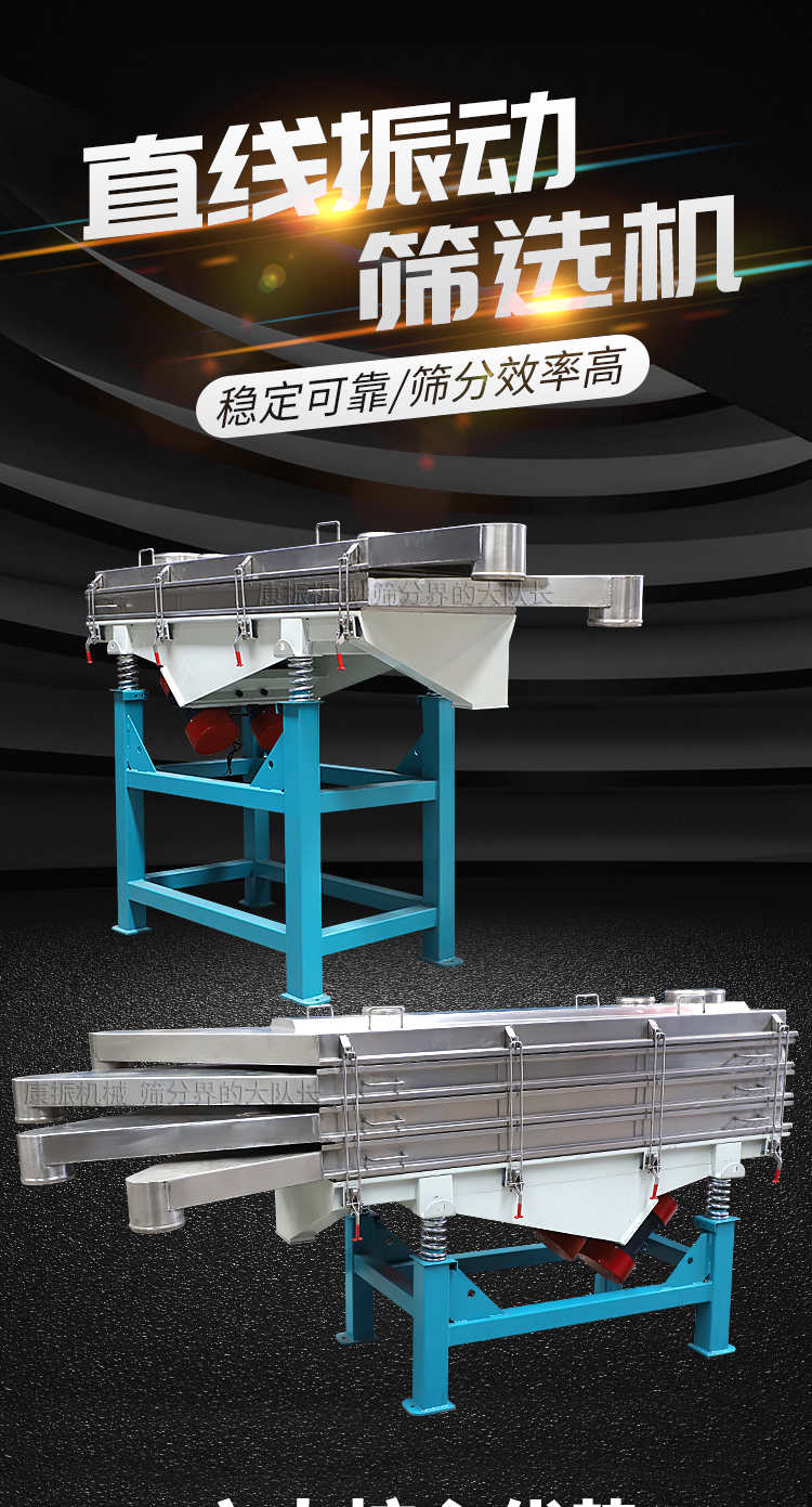 是以利用振動電機激振作為振動源,使物料在篩網上被拋起,同時受力向前做直線規則運動,物料從給料機均勻地進入篩分機的進料口,通過多層篩網產生數種規格的篩上物、篩下物、從各自的出口排出。具有耗能低、產量高、結構簡單、易維修、全封閉結構,無粉塵溢散,自動排料, 更適合于高產能流水線作業。