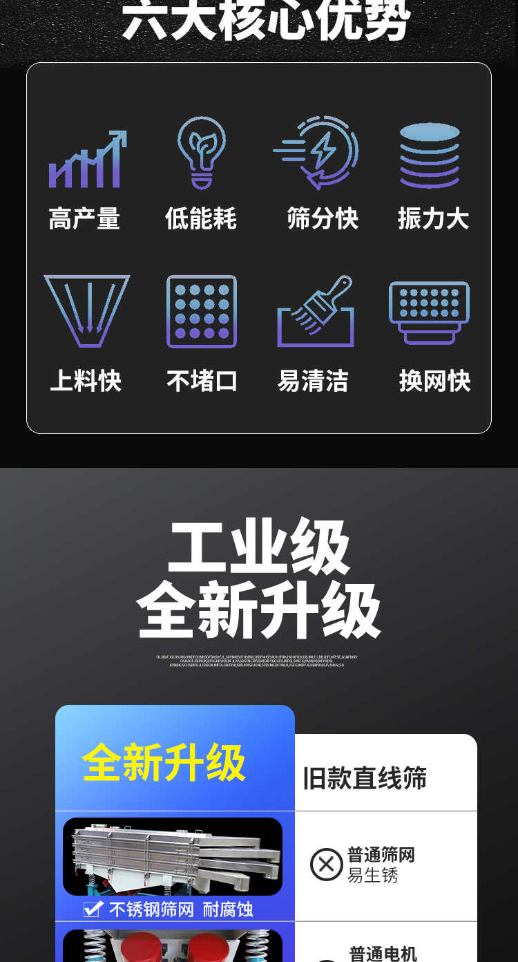直線振動篩(直線篩)穩定可靠、消耗少、噪音低、壽命長、振型穩、篩分效率高等優點。