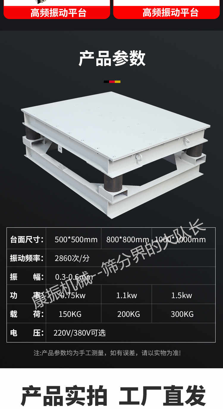 被廣泛應用于試驗室、現場工地作試件成型和預制構件震實各種板柱、梁等混凝土構件振實成型,并應用在冶金、模具、食物、化工、建材等行業。