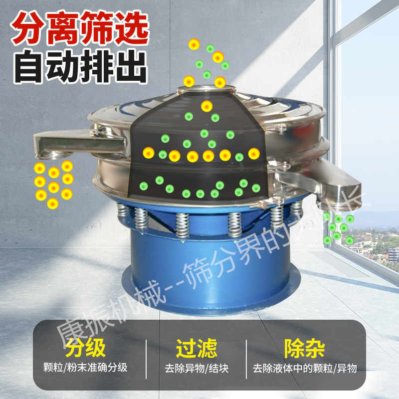 任何顆粒、粉末、粘液一定范圍內均可篩選。篩分細至500目或0.028mm, 過濾小可至5微米。分級篩選,可篩一至五層篩網,能同時進行二至六個等級的分選或過濾。